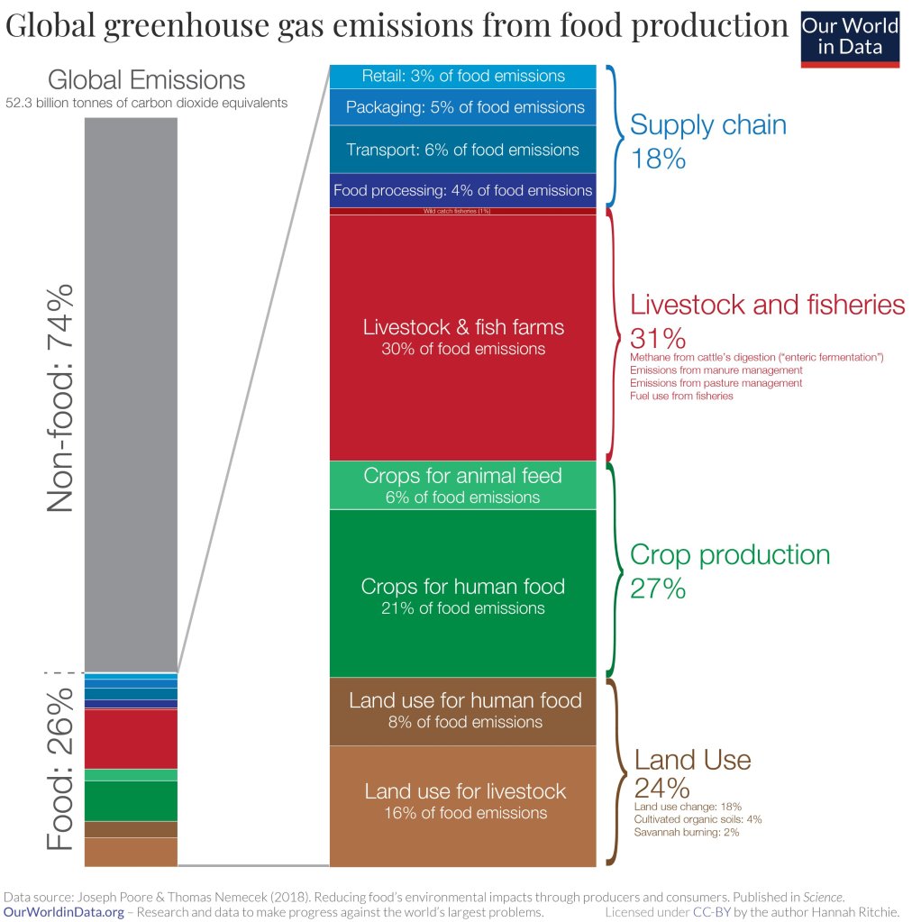 But I’m sure I don’t have to tell you, that greenhouse gases have far-ranging environmental & health effects. They cause climate change by trapping heat, & they also contribute to respiratory disease from smog & air pollution. Extreme weather, food supply disruptions, & increased wildfires are other effects of climate change caused by greenhouse gases. That said, 25% of green house gas emissions come from food production, which would be much less if we were a plant based society. The chart below clearly shows how above all else, cows in both meat herds & dairy herds make up most of that percentage. Not to mention, every other meat product speaks for itself.